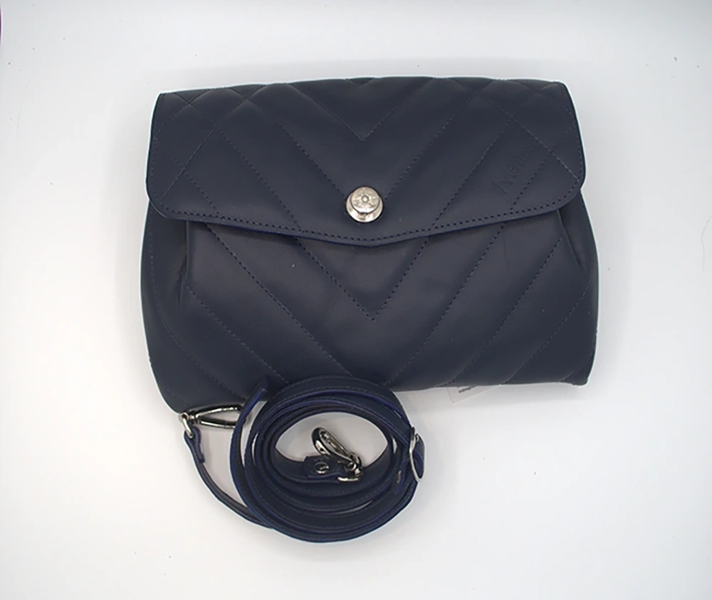Confectionné en cuir de veau pleine fleur italien lisse bleu marine issu de réemploi, ce sac à main associe éco responsabilité et durabilité. Porté épaule ou bandoulière grâce à sa sangle ajustable et confortable.