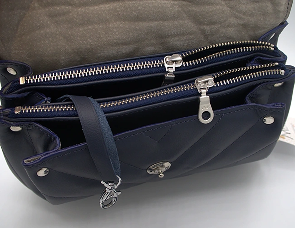 Confectionné en cuir de veau pleine fleur italien lisse bleu marine issu de réemploi, ce sac à main associe éco responsabilité et durabilité. Porté épaule ou bandoulière grâce à sa sangle ajustable et confortable.