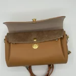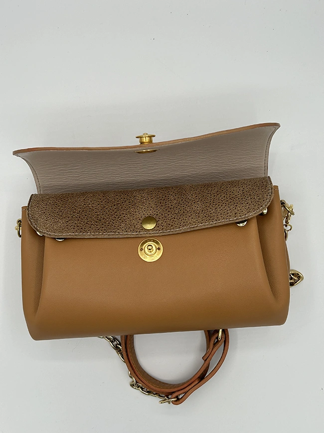 - Extérieur : Cuir de veau pleine fleur lisse camel – cuir français, souple.
