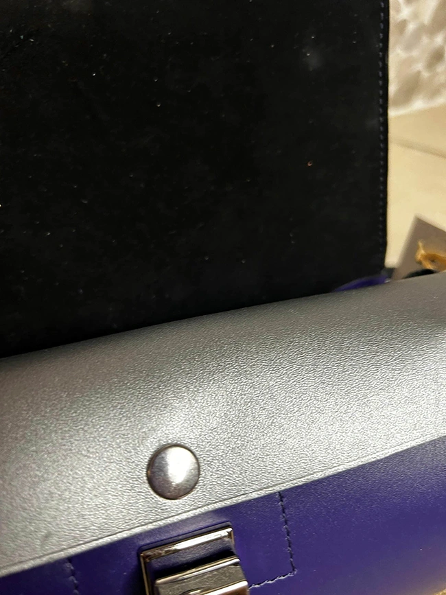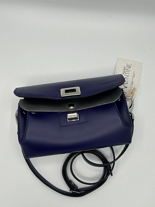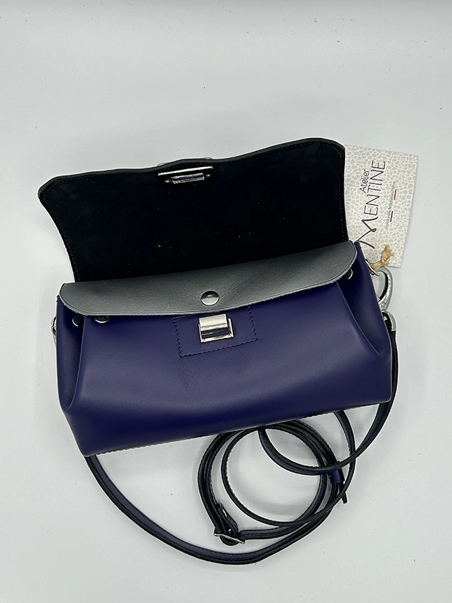 - Extérieur : Cuir de veau pleine fleur lisse violet foncé – cuir italien.