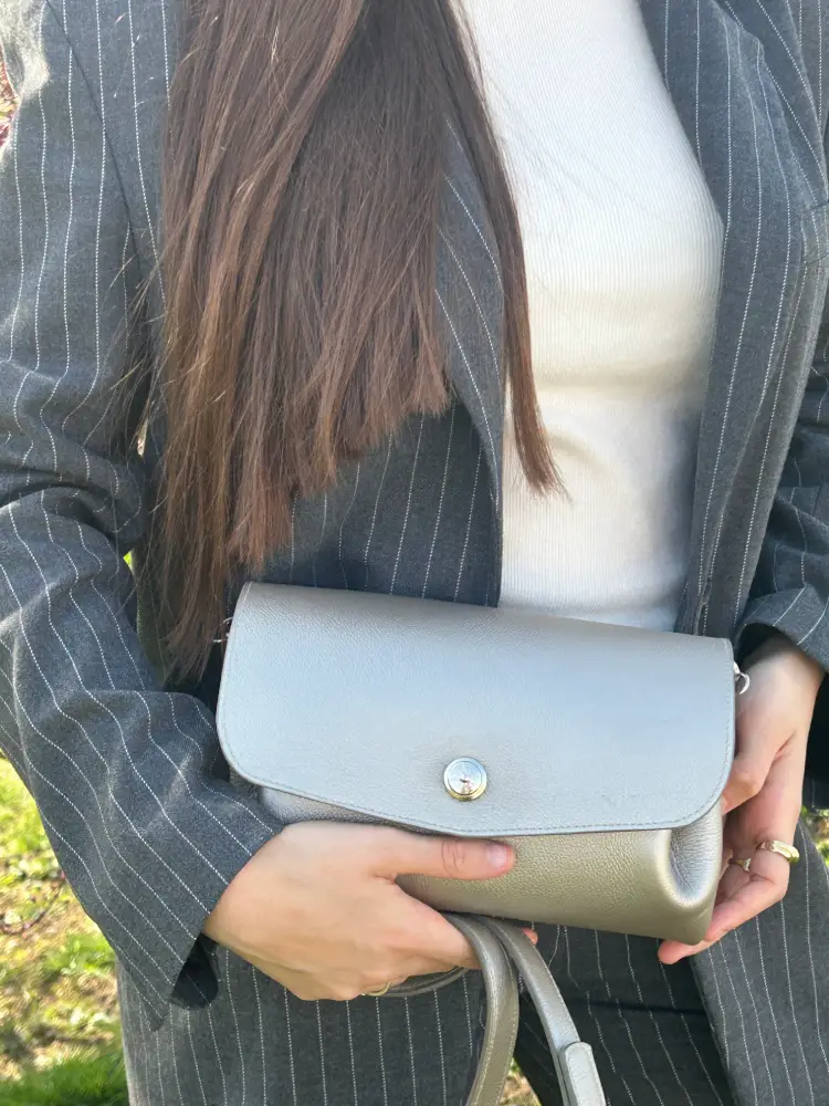 - Extérieur : Cuir de veau pleine fleur grainé gris tourterelle, mourning dov – cuir italien. Cette couleur évoque un gris chaud et doux