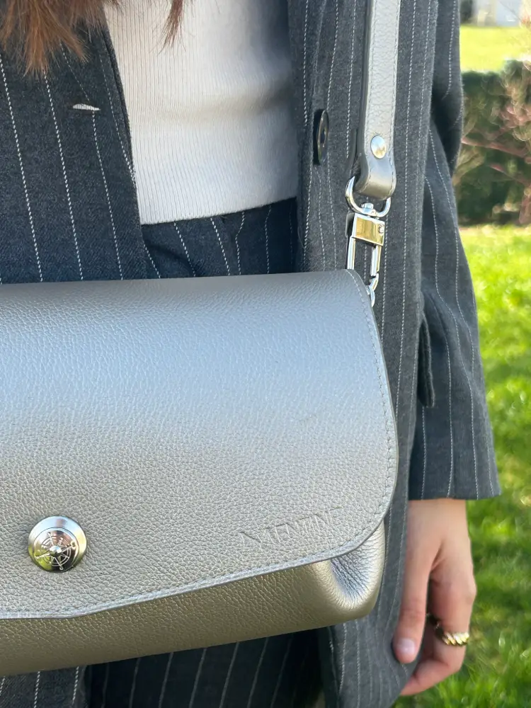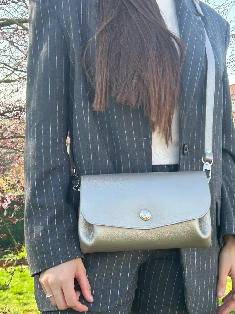 - Poche intérieure : Cuir de veau pleine fleur lisse gris bronze – cuir italien.
